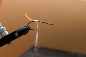 Pidä lanka toimenpiteen ajan kireällä. Materiaalin pitäisi nyt kiertyä ”hapsottamaan”. Näin menetellen saat materiaalin kiristettyä langan sisään ja voit aloittaa langan ja dubbingin kiertämisen koukun varrelle.